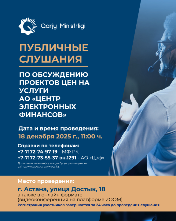 The public hearings will be held on December 18, 2025, at 11:00 a.m. at the address: 18 Dostyk Street, Astana, as well as online (via videoconference on the ZOOM platform). Additional information will be published on the websites www.gov.kz, www.ecc.kz.